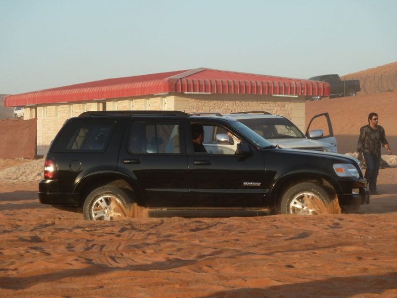 Es kam wie es kommen musste. All par hundert Meter blieb sie im Sand stecken und musste von den anderen Befreit werden. Immer wieder stiegen sie aus…Zum einen war es ein lustiger Anblick, so aufgetakelte Frauen im der Wüste zu sehen, mit Chihauau im Arm. Haben nur noch die Stöckelschuhe gefehlt.. Aber zum anderen war es halt auch mühsam immer wieder warten zu müssen.