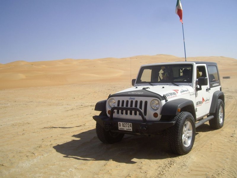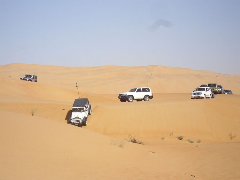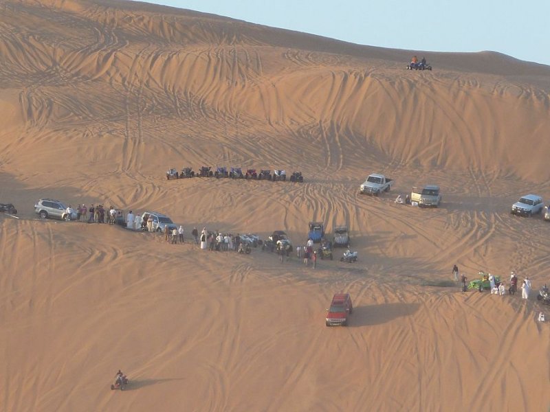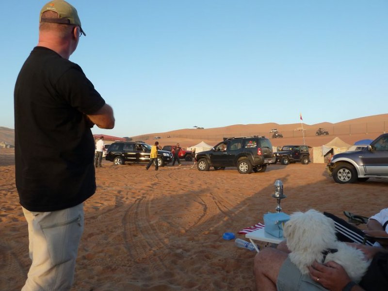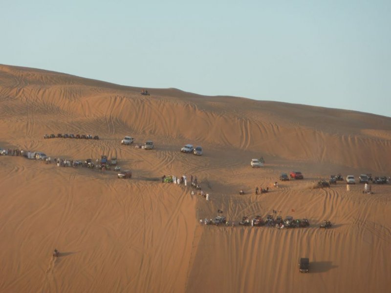 Pünktlich wie die Sonnenuhr stehen die beiden mit ihren 4×4 Fahrzeugen am Freitagmorgen vor unserer Haustüre und es konnte losgehen. Leider mussten die beiden sich mit dem Tempo etwas zurückhalten, da wir mit unserem Truck nur so um die 80-90km/h fahren können. Aber sie hielten sich tapfer.. auf der ca. 350 Kilometer langen Fahrstrecke gesellte sich noch Eslam mit seiner Frau dazu. Die Fahrt führte über Abu Dhabi und über endlose Wüstenlandschaften. Nach ca. 5 Stunden fahrt sind wir endlich bei dem Festival angelangt. Tausende autoverrückte Araber und Leute aller Nationalitäten fuhren mit Ihren 4×4 Trucks, aufgemotzten Buggies, Quads und Motorrädern durch die Dündenlandschaft. Es war ein einmalig herrlicher Anblick.