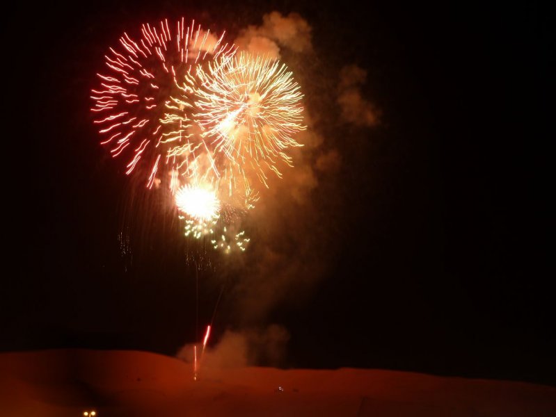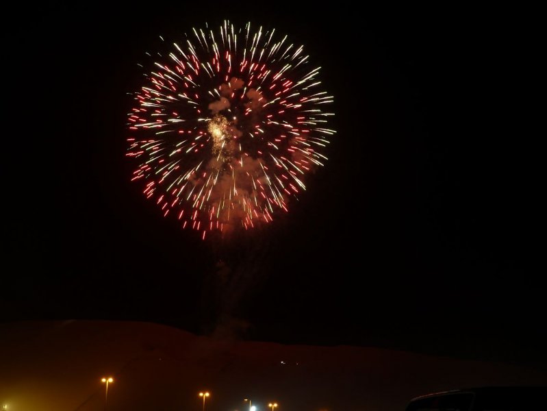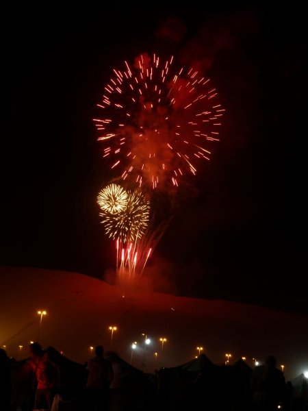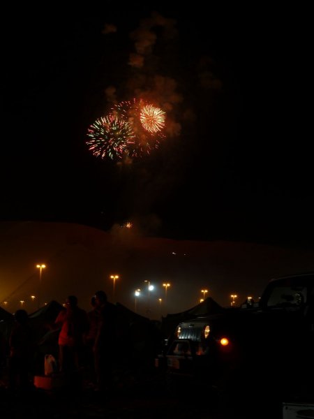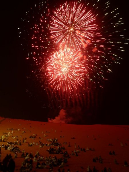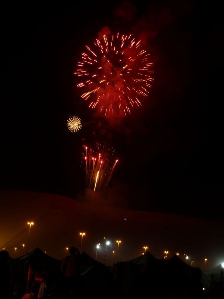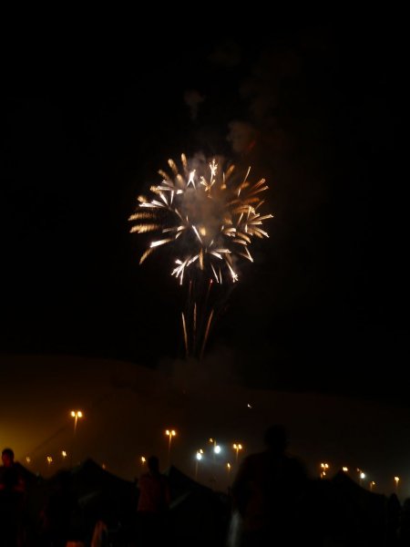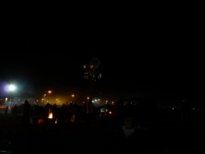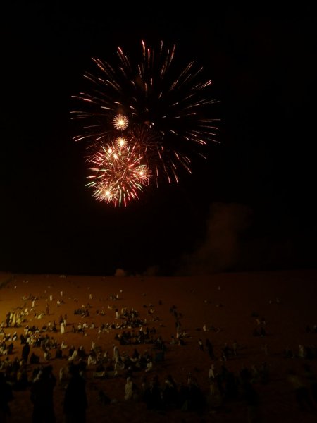 Eine feierliche Stimmung herrscht auf dem Gelände, umringt von ohrenbetäubendem Motorenlärm. Als es dunkel wird, wird auf der höchsten Düne bereits das erste Feuerwerk abgeschossen. Zum Glück haben wir unseren Hund bereits im Auto geparkt, so musste sie sich das nicht mit ansehen. Es sah gigantisch aus wie die Feuerwerkskörper die Wüstenlandschaft erhellen lassen.