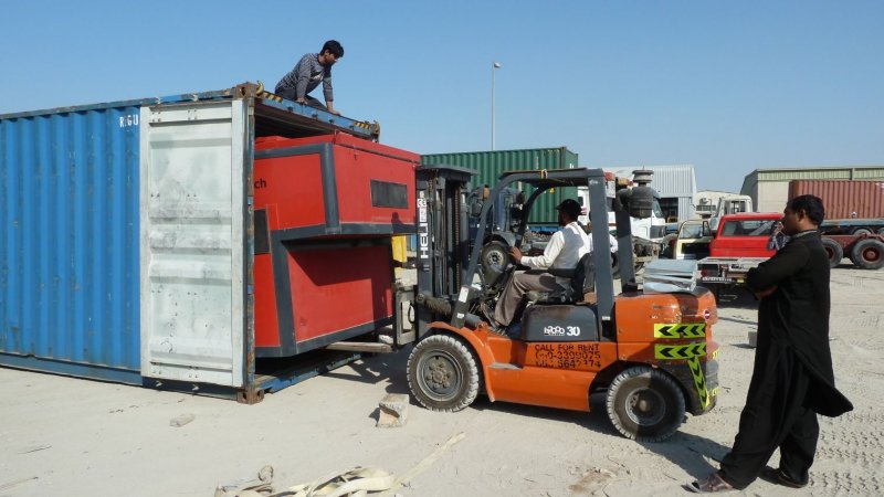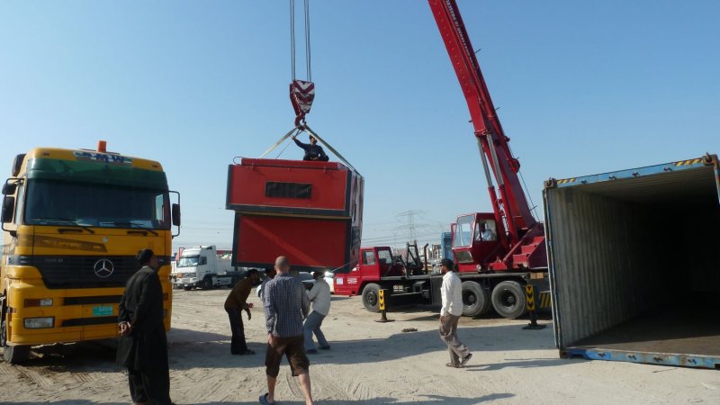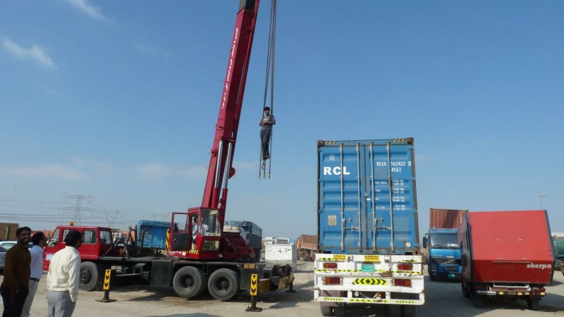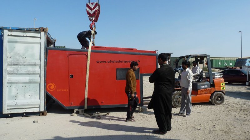 Der Container war bereits da, sowie auch der Kran welcher unsere Box vom Auto nehmen soll.