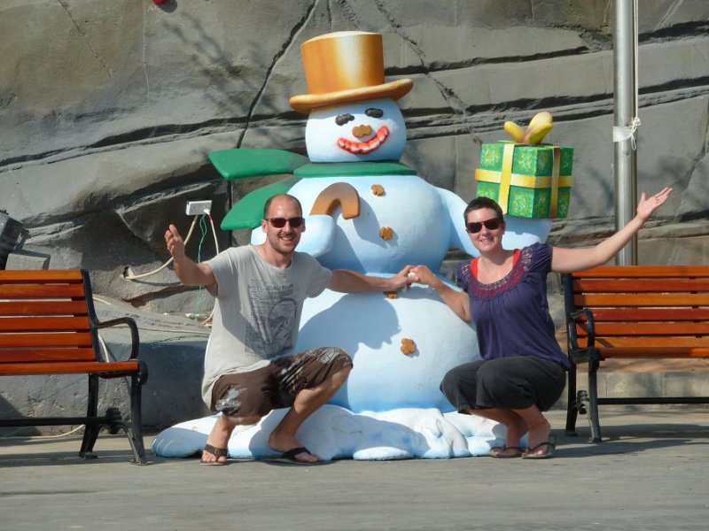 Um 11.00 Morgens (1 Stunde nach Türöffnung) stehen wir dann vor dem riesigen künstlichen Eisberg mit etlichen von Pinguinen drauf.. Die Araber haben sich hier ziemlich viel Mühe gegeben. Im Eingangsbereich begrüssen uns dutzende Mitarbeiter…jeden Meter den man geht klingt es „Good Morning..How are You“….Wir werden durch den riesigen Umkleideraum geführt und alles wird haargenau erklärt.. wir müssen bemerken, dass wir hier eigentlich die Einzigen Gäste sind im Park…wie cool J