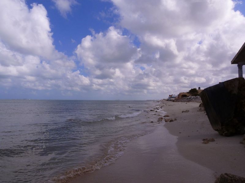 Am nächsten Tag geht es hoch in die Provinzhauptstadt Merida, einmal durch und weiter an die Strände bei Puerto Progreso. Der Campground besteht aus ein paar kleinen Häusschen welche vermietet werden und einer Wiese auf welcher wir unseren Dodge für eine Nacht für 170 Pesos abstellen dürfen. Der Strand ist nur ca. 200 Meter entfernt, doch die Häuser wurden so nahe an das Meer gebaut das bei Flut kaum Platz für einen Durchgang bleibt. Viele der ehemaligen Ferienresidenzen sind seit dem Hurricane 2001 nur noch Ruinen und scheinbar hatte man weder Geld noch Lust übrig die wieder aufzubauen.