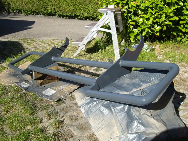 Nach der 2 Komponenten Grundierung wurde die RAL3000 2-K Farbe mit dem Farbpistole und Kompressor aufgetragen.